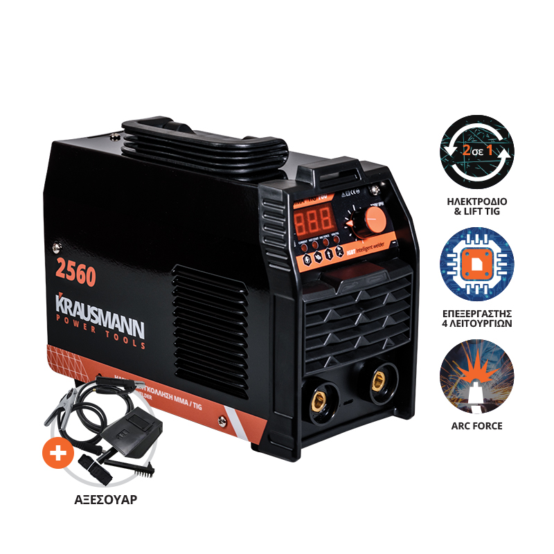 Ηλεκτροσυγκόλληση τύπου πιστόλι 120A, με επεξεργαστή 4 λειτουργιών: VRD, Hot Start, ARC Force, AntiStick. Κατάλληλο για συγκόλληση χάλυβα, ανοξείδωτου χάλυβα, χυτοσίδηρου και σκληρής επίστρωσης, χρησιμοποιώντας ηλεκτρόδια από Ø1.5 mm έως Ø3.2 mm.